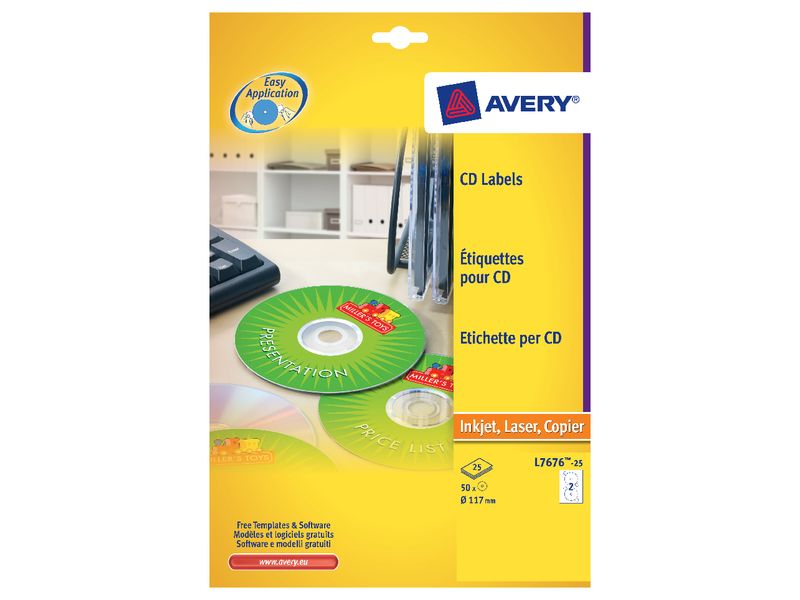 AVERY CAJA 100 HOJAS ETIQUETAS CD/DVD DIAMETRO 117 MM INKJET MATE 200 UD. REF. L7676-100